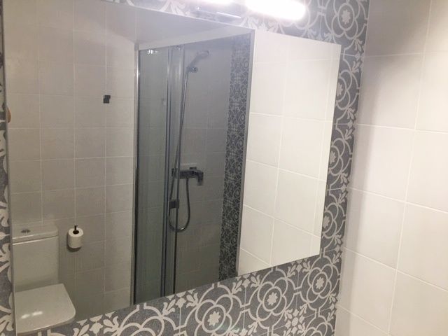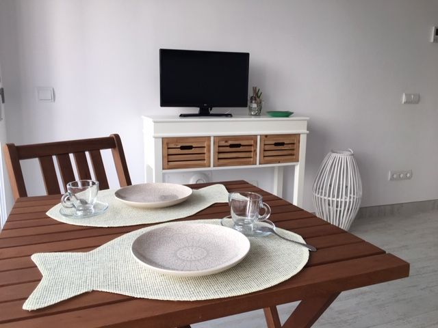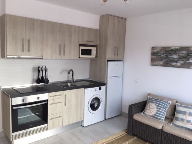 El salón comedor está equipado con un sofá, mesa para 2 comensales y TV. La cocina está totalmente renovada y es moderna, equipada con utensilios básicos como nevera, vitrocerámica, horno, microondas, lavadora y enseres y utensilios de cocina.