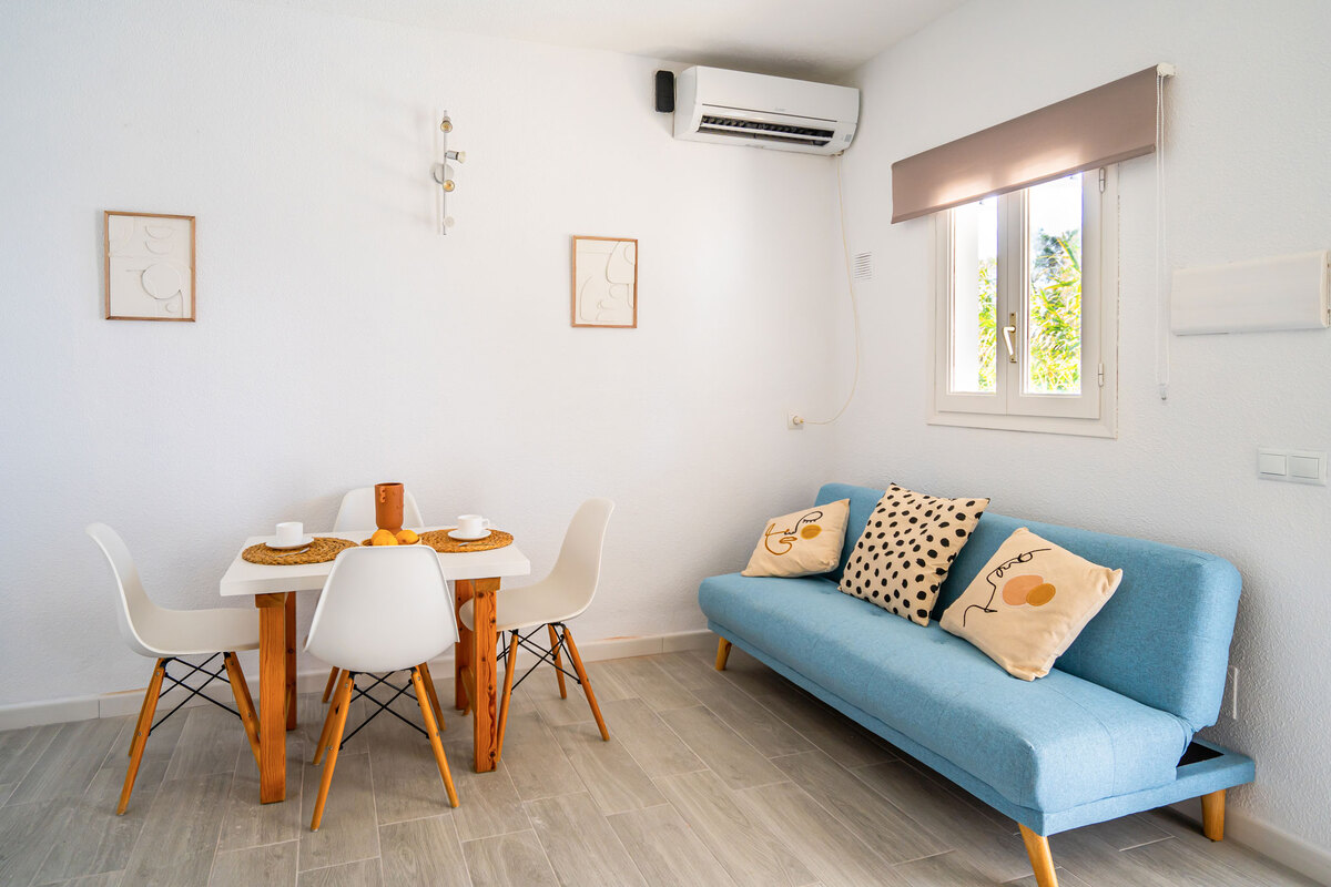 con una mesa central y un cómodo sofá cama. En la misma estancia tiene