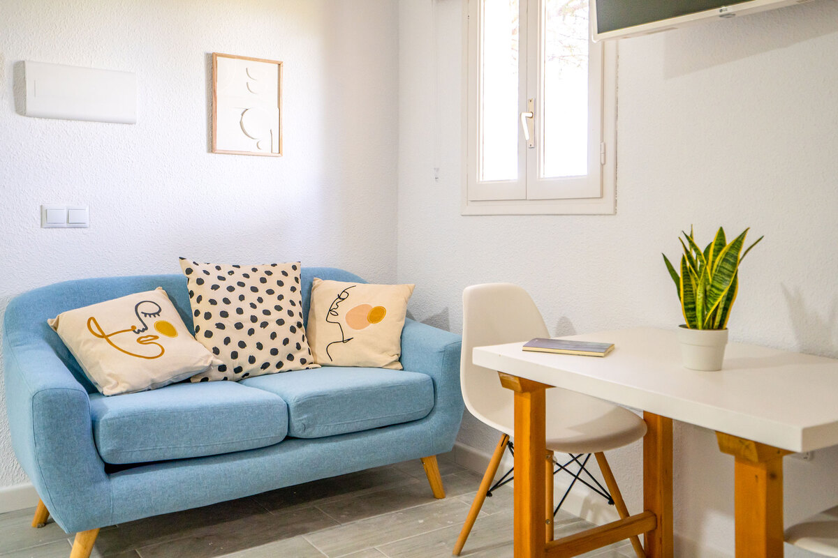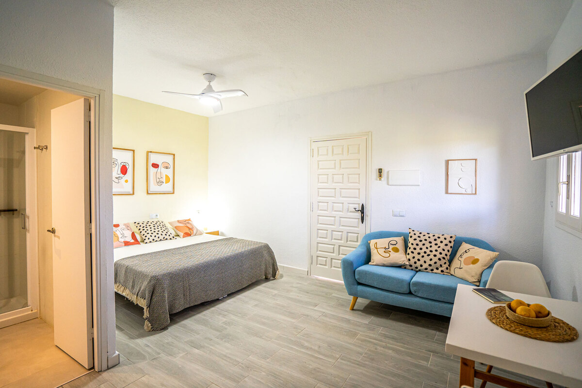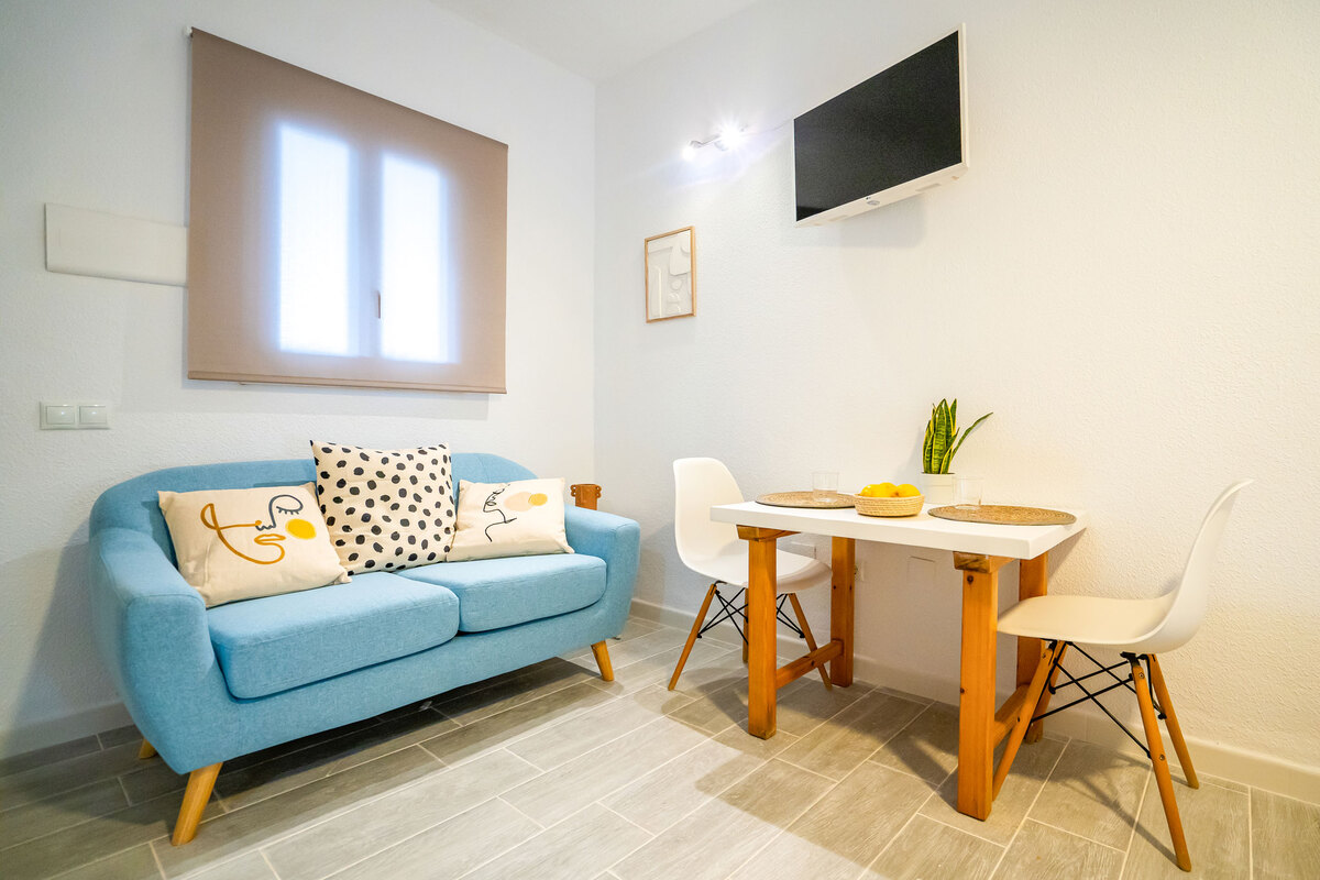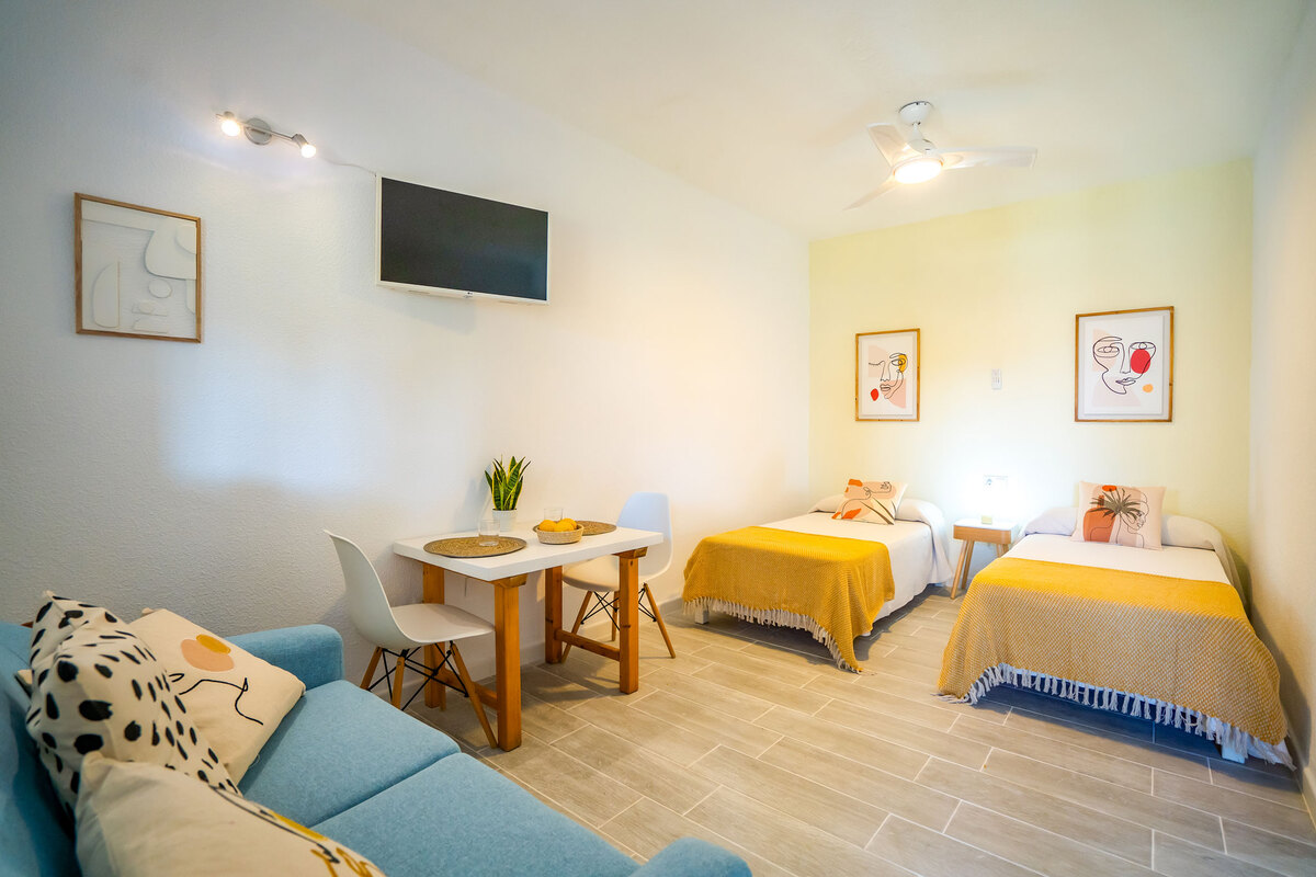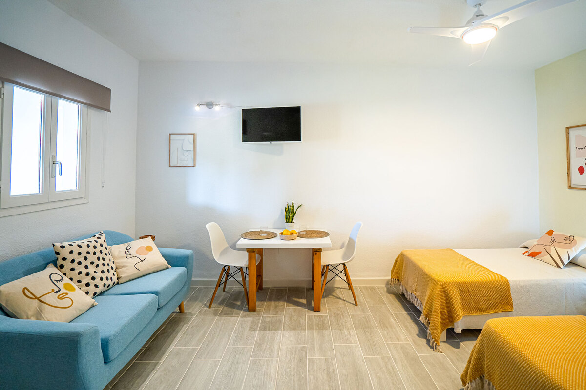 El estudio está formado por un único ambiente con todo el espacio abierto, organizado de forma hábil para crear zonas diferenciadas. La sala de estar está amueblada con un cómodo sofá y mesa central. La zona de noche tiene una cama matrimonial o dos camas individuales, según disponibilidad, con una decoración muy cuidada, creando un ambiente placentero y acogedor. Cada estudio permite alojar cómodamente a un máximo de 2 personas.