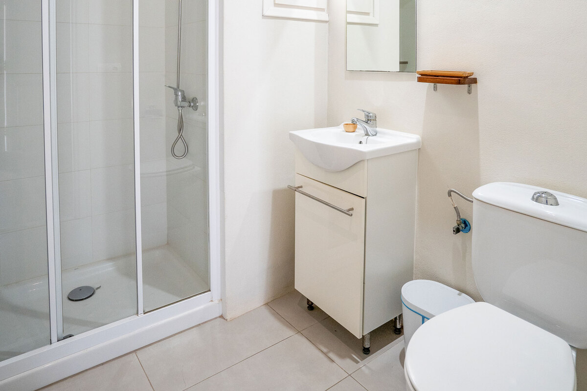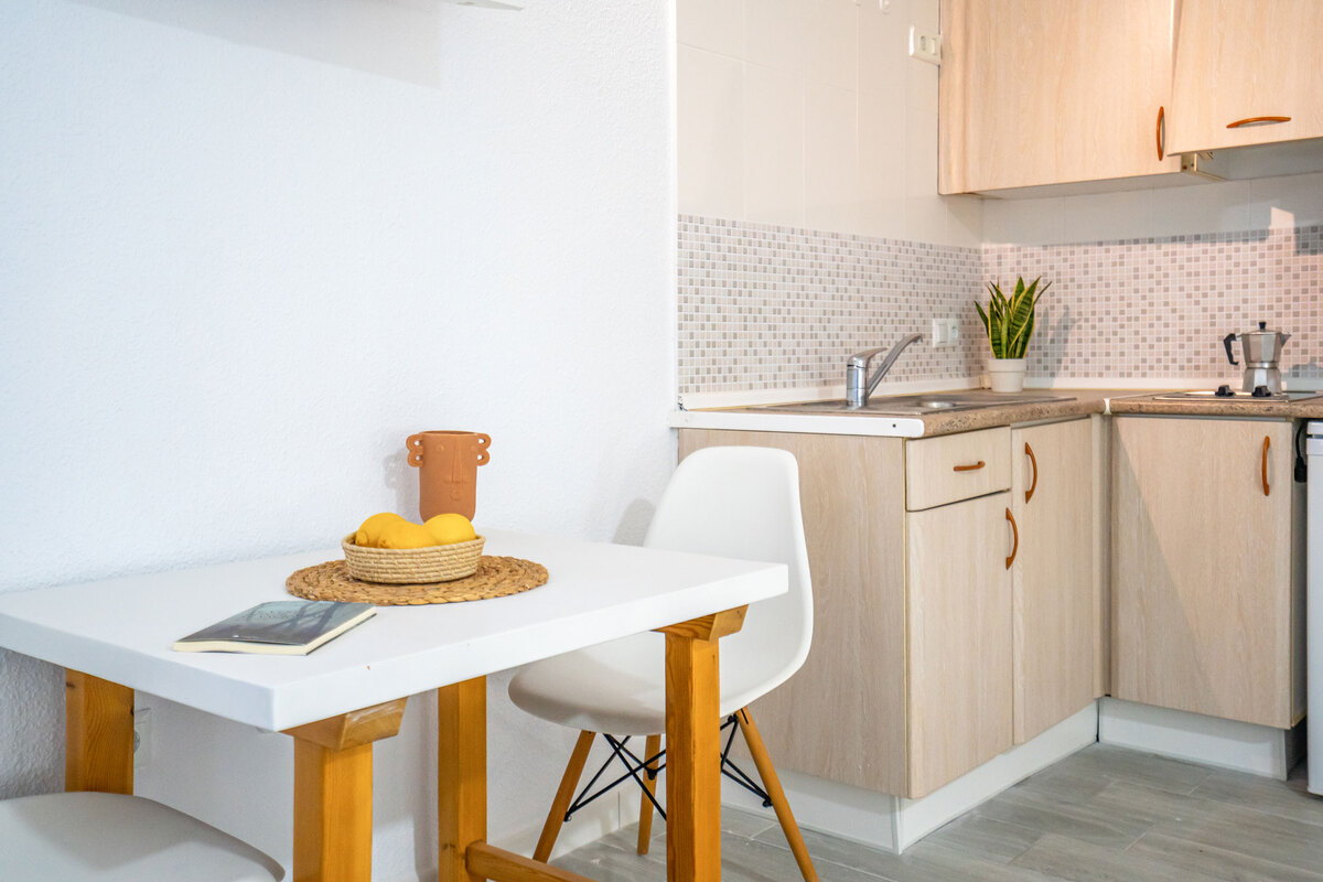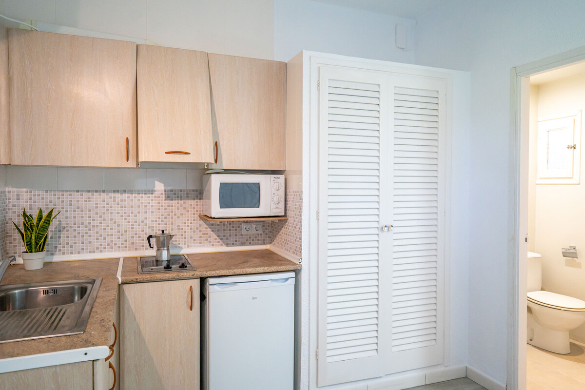En la misma estancia tiene una cocina americana funcional muy bien equipada con los utensilios necesarios para pasar una estancia vacacional: nevera, vitrocerámica, microondas y enseres de cocina. Dispone de un cuarto de baño equipado con ducha.