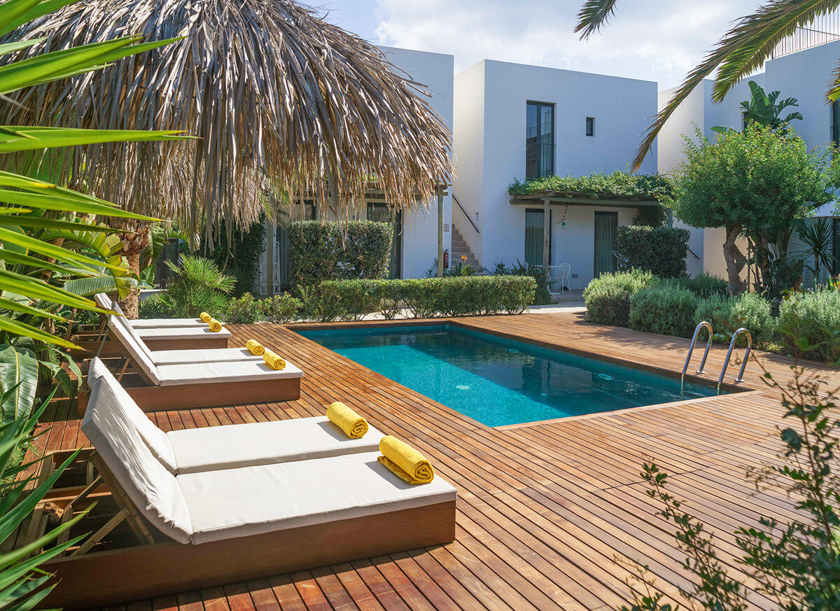 bellísimas playas de Formentera. La zona que rodea la piscina es un entorno apacible y cálido, con un paisaje de colores vivos: