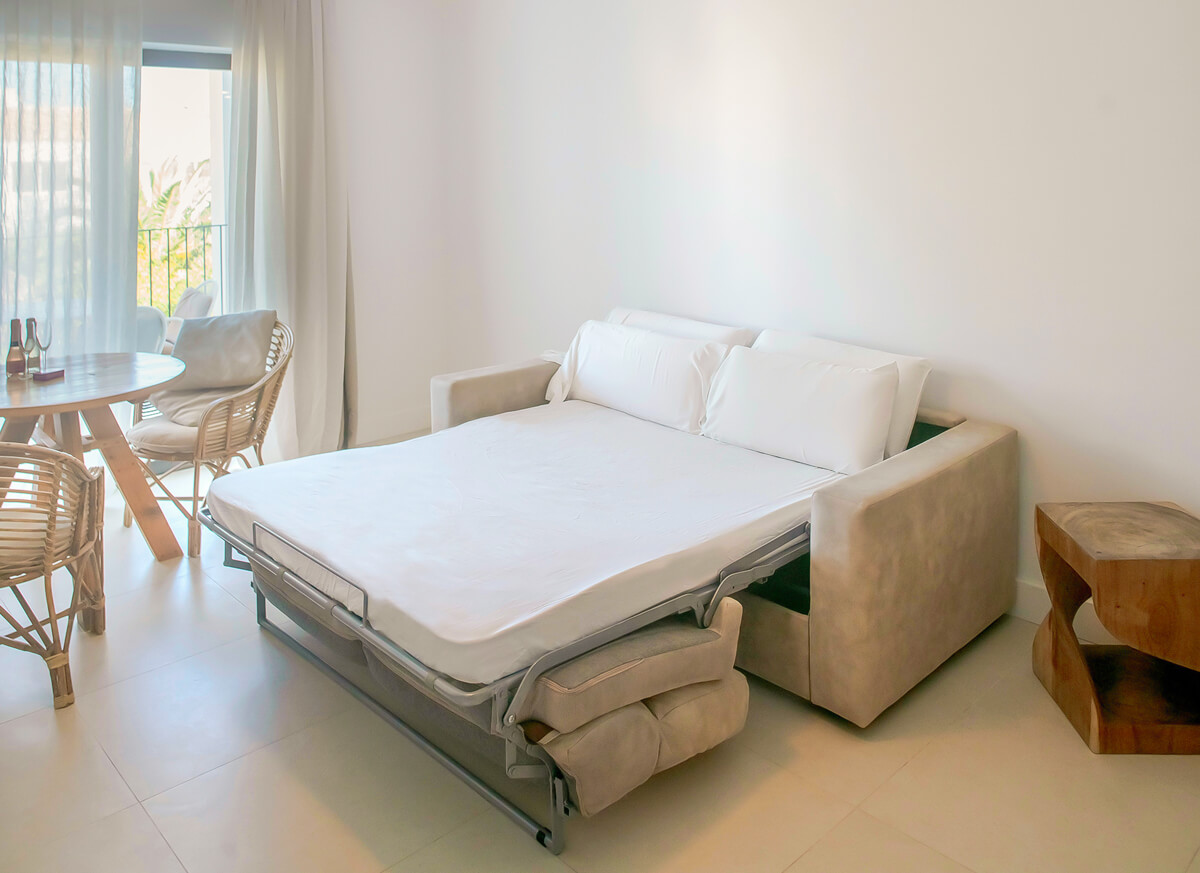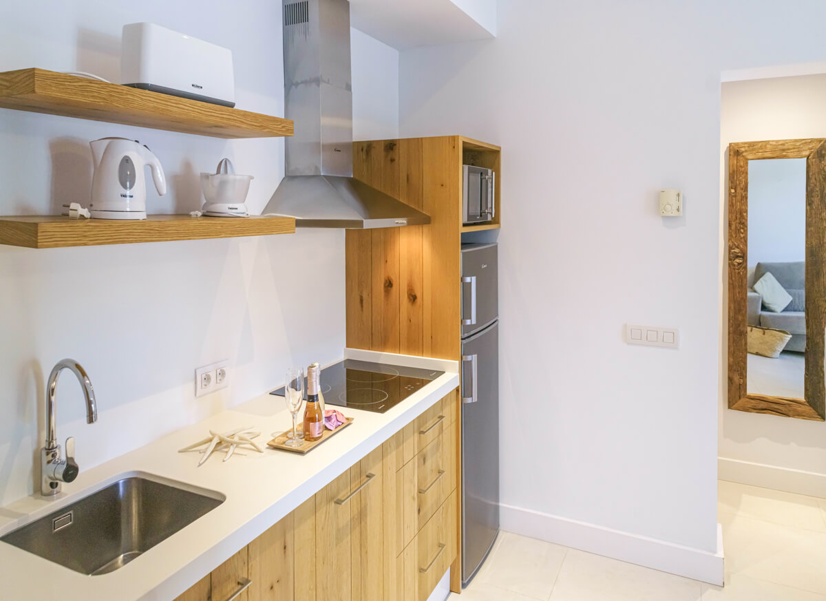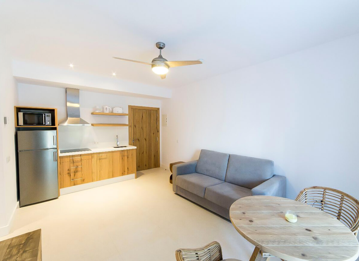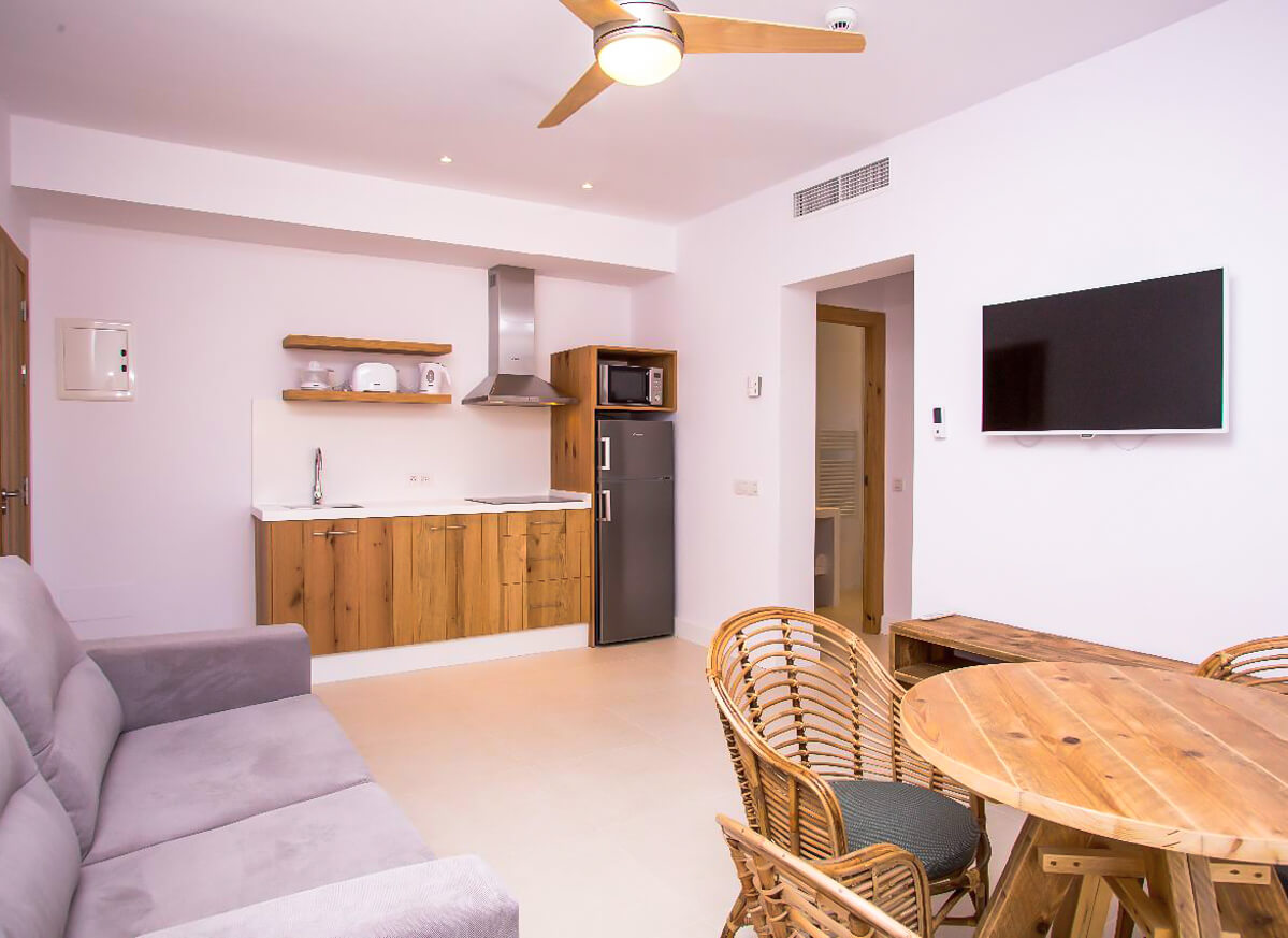 Están formados por una sala de estar amueblada con un cómodo sofá cama de 2 plazas y mesa central. La cocina está integrada en el salón, es muy funcional y totalmente equipada con placa vitrocerámica, nevera, microondas y enseres y utensilios de cocina (como exprimidor, tostadora, hervidor de agua y cafetera).