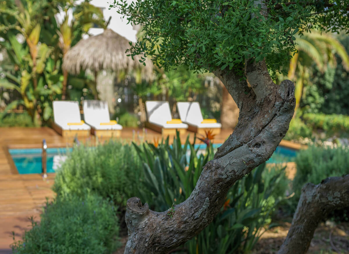 La zona exterior y la piscina combinan de forma natural con la vegetación que la rodea, logrando un resultado armonioso y bello.