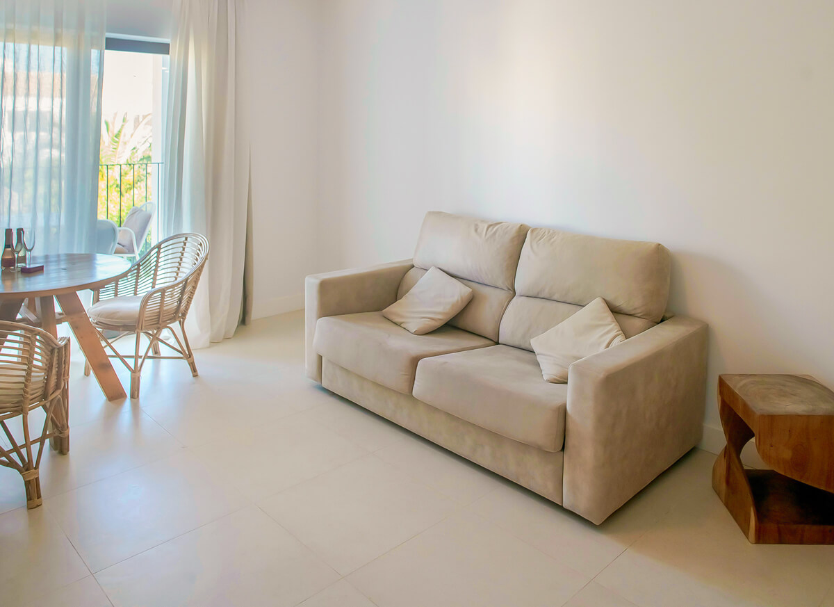 Los apartamentos, situados en planta baja y en primera planta, ofrecen un mobiliario cómodo y confortable, con el objetivo de transmitirte calma y relax en su interior.