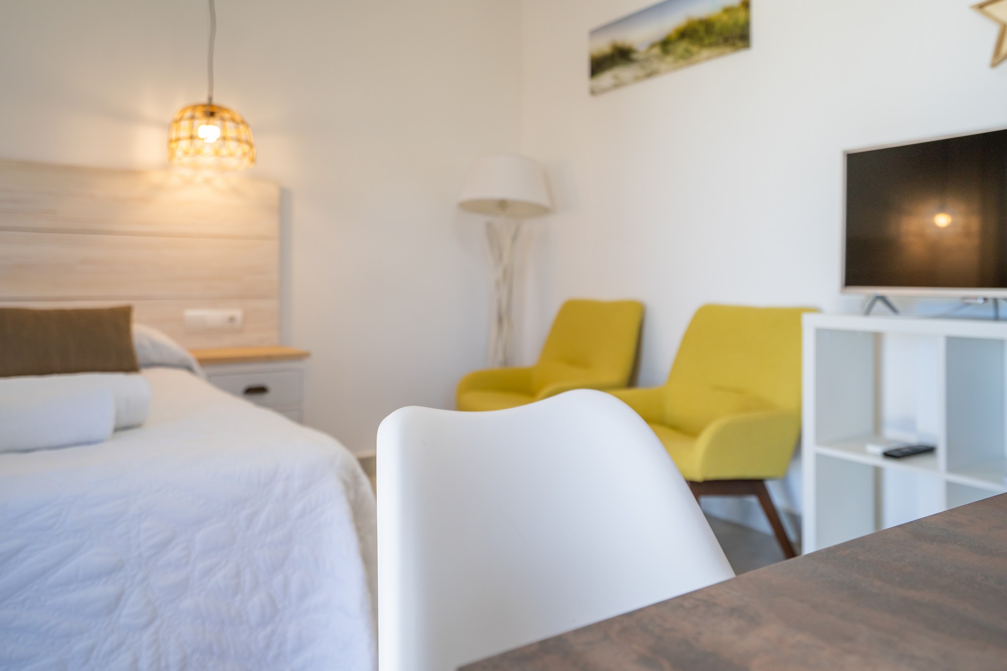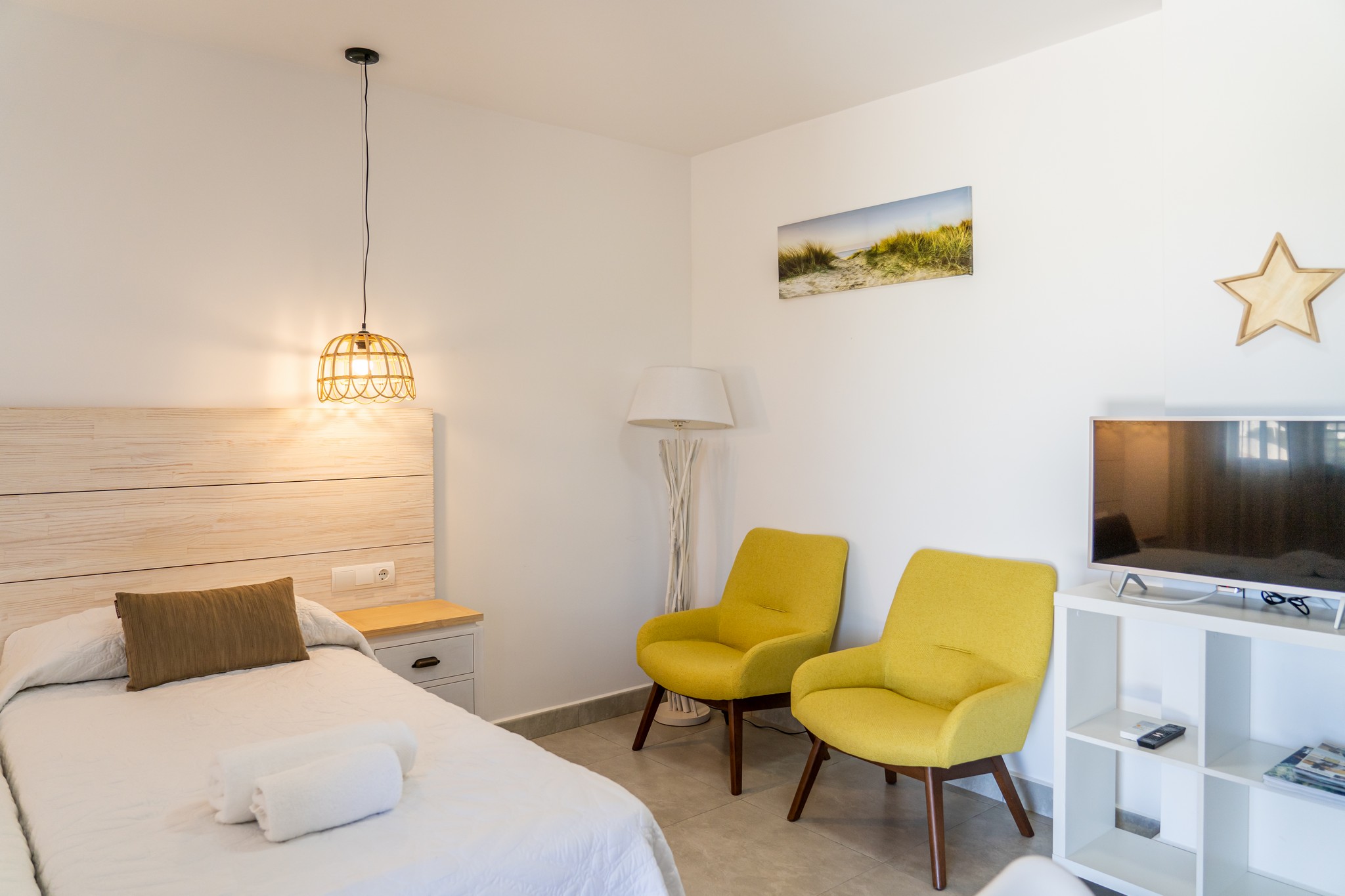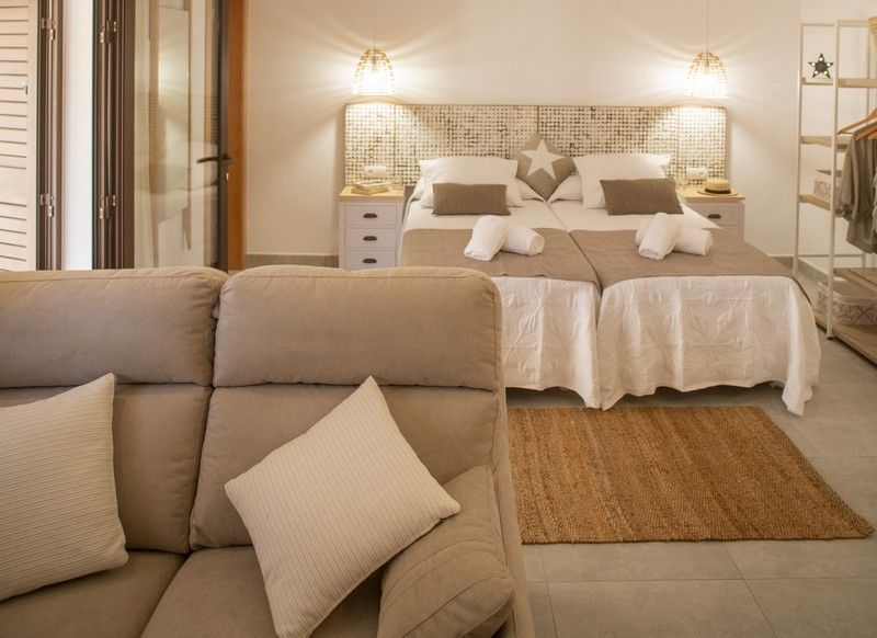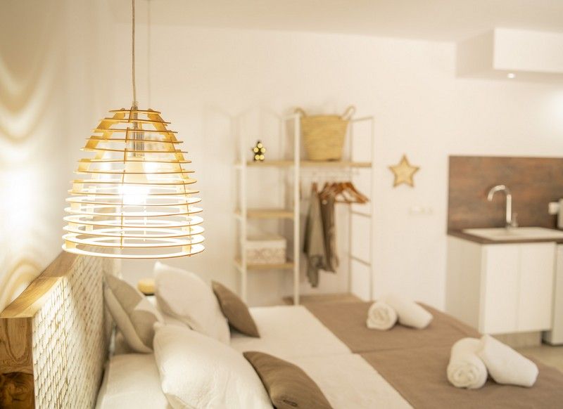 Los estudios tienen una cuidada decoración típicamente isleña, donde predominan los colores blancos y la madera, con un elegante diseño interior. Son cómodos y confortables, y están bien equipados para estancias vacacionales, permitiendo alojar cómodamente a un máximo de 2 personas.