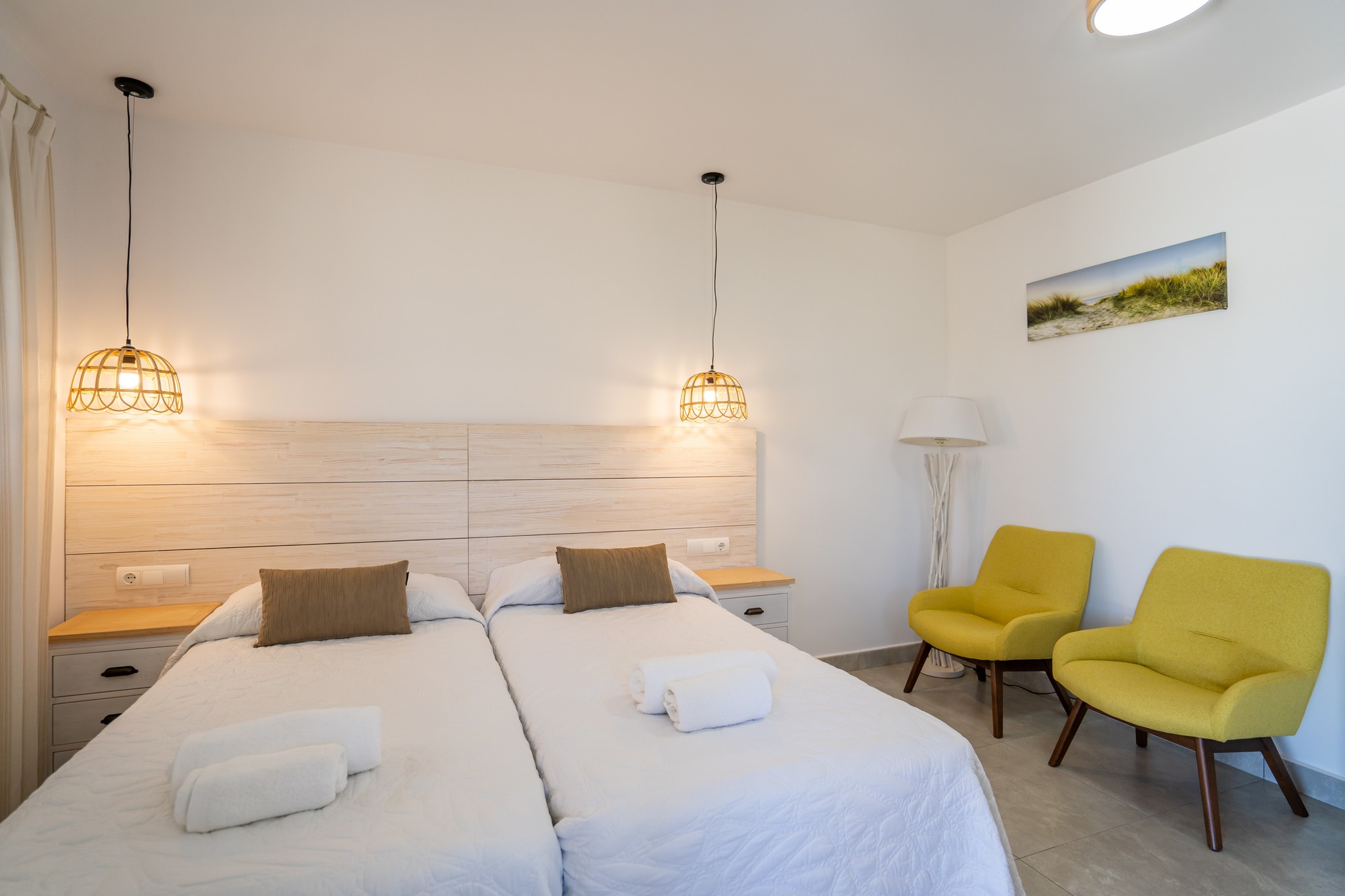 sala de estar está amueblada con un cómodo sofá y mesa central. La zona de noche tiene dos camas individuales con una decoración muy